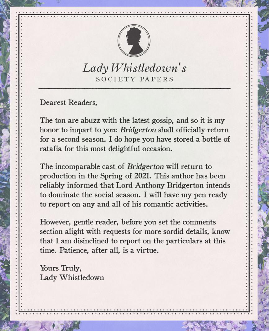Lady Whistledown is delighted to report Bridgerton shall return for a second season.