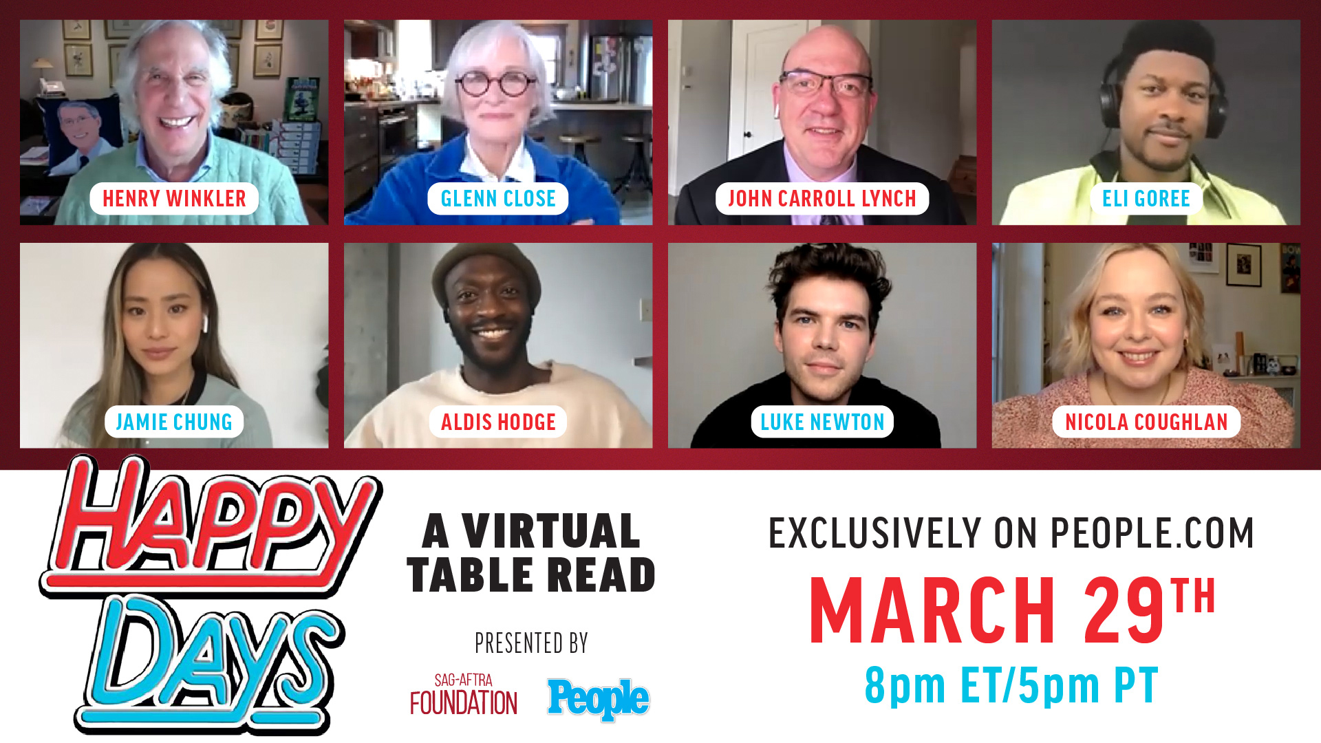 As part of the special episode live read, Glenn Close will play Marion Cunningham, John Carroll Lynch will take on the role of Howard Cunningham. Eli Goree and Aldis Hodge will play Richie Cunningham and Ralph Malph, respectively.